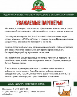 Поэтому информируем Вас, что в это непростое для всего мира время, компания «ДАЛК» работает в привычном для Вас режиме и все мы доступны для связи по телефону и на почте.